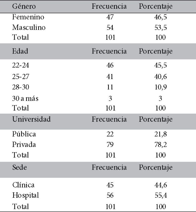 Del total de 101 internos de medicina, 56 (55,4%) realizaron su internado en Hospitales del estado y 45 (44,6%) en Clínicas particulares; el 45% tenían edades entre 22-24 años siendo el mayor porcentaje y tan solo el 3% tenían 30 años a más; así mismo el 78,2% eran estudiantes de universidades privadas y el 21,8% de públicas, con un total de 44,6% mujeres y 46,5% varones. (Tabla 1)