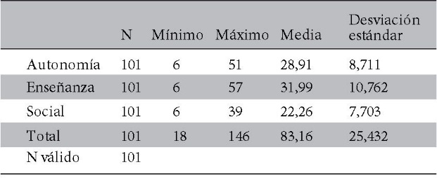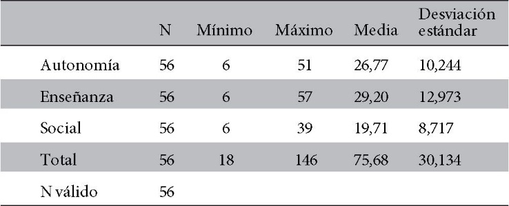 Respecto a los 56 estudiantes que realizaban su internado en los Hospitales del estado la media global fue de 75,68, lo que indica un ambiente educacional con muchos problemas. La media de la dimensión “Percepción del rol de autonomía” indica una visión negativa del rol de cada uno(media=26,77), en la dimensión “Percepción de la enseñanza” en necesidad de algún reentrenamiento (media=29,20) y en la dimensión “Percepción del soporte social” lugar poco placentero (media=19,71). (Tabla 4)