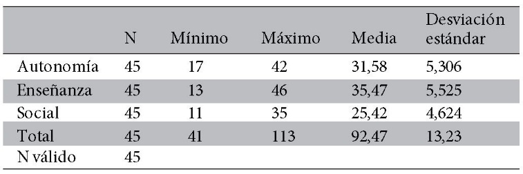 La tabla 3 muestra los puntajes totales y por dimensiones de los 45 estudiantes que realizaban su internado en clínicas particulares La puntuación media global fue de 92,47 indicando un ambiente educacional más positivo que negativo con espacio para mejorar, el análisis por dimensión muestra que la media para la “Percepción del rol de autonomía” se encontró una percepción más positiva del trabajo de cada uno (31,58), en la dimensión “Percepción de la enseñanza” encaminado en la dirección correcta (m=35,47), y en la dimensión “Percepción del soporte social” más pros que contras (media=25,42)