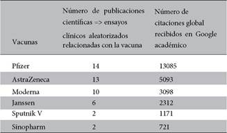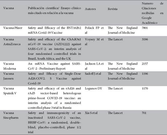 La producción científica respecto a las vacunas de la Covid-19, la más citada fue la Vacuna pfizer en la revista The New England Journal of Medicine mediante Google académico, a sí mismo, de manera sucesiva se citaron las vacunas Pfizer, Moderna y Janssen haciendo un total de 11 154 citaciones. En la revista The Lancet se citaron las vacunas AstraZeneca, Sputnik V y Sinopharm haciendo un total de 5 067 citaciones. En relación al apoyo en las citaciones de las vacunas de la covid 19 a través de Google académico se relaciona con la distribución mundial de cada una de ellas11-13.