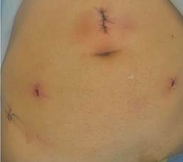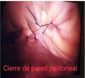 Se realizo resección de fistula vesicovaginal por abordaje extravesical laparoscópico, el procedimiento se realizó bajo anestesia general balanceada, en primer tiempo se introdujo un cistoscopio de 21 Fr, se localizó el orificio fistuloso a través del cual se introdujo un catéter ureteral, hasta obtenerlo en vagina (Figura 1b), con apoyo de dos catéteres ureterales open-end, se ascendió los catéteres ureterales bilateral hasta cavidades renales, y el otro extremo se dejó exteriorizado, se procede a colocación de sonda Foley 18 Fr, se coloca al paciente en trendelemburg 45°, protección de puntos de apoyo, se realiza antisepsia abdominogenital, colocación de campos estériles, se realiza incisión supraumbilical, se coloca trocar de 10 mm, se insufla neomoperitoneo 12 mmHg, se colocan 3 trocares de trabajo de 5 mm, 2 pararrectales, 1 sobre la cresta iliaca anterosuperior derecha (Figura 2), se incide el peritoneo de la cúpula vaginal, con apoyo de una valva maleable introducido a través de la vagina, a modo de movilizador vaginal, se expone la cúpula vaginal, y con tijera en frio se inicia la disección y separación de piso vesical de cara anterior de vagina (Figura 3), se completa la disección de la totalidad de la fascia vesicovaginal, hasta localizar el trayecto fistuloso, con apoyo de un catéter transfistula, el cual se secciona, se retira catéter, se amplia y revitaliza bordes de vejiga y vagina (Figura 4), y se procede a cierre con hilo V - Loc ™ 2-0, en planos diferentes, vagina cierre horizontal, vejiga cierre vertical, se procede a llenar la vejiga con 500 cc de azul de metileno para corroborar hermeticidad adecuada, y se procede a cierre de peritoneo, tratando de colocar peritoneo como parche entre vejiga y vagina, para ayudar a separar las estructuras (Figura 5), se dejó drenaje tubular, y se deja los catéteres ureterales exteriorizados y conectados a la sonda Foley por 10 días.