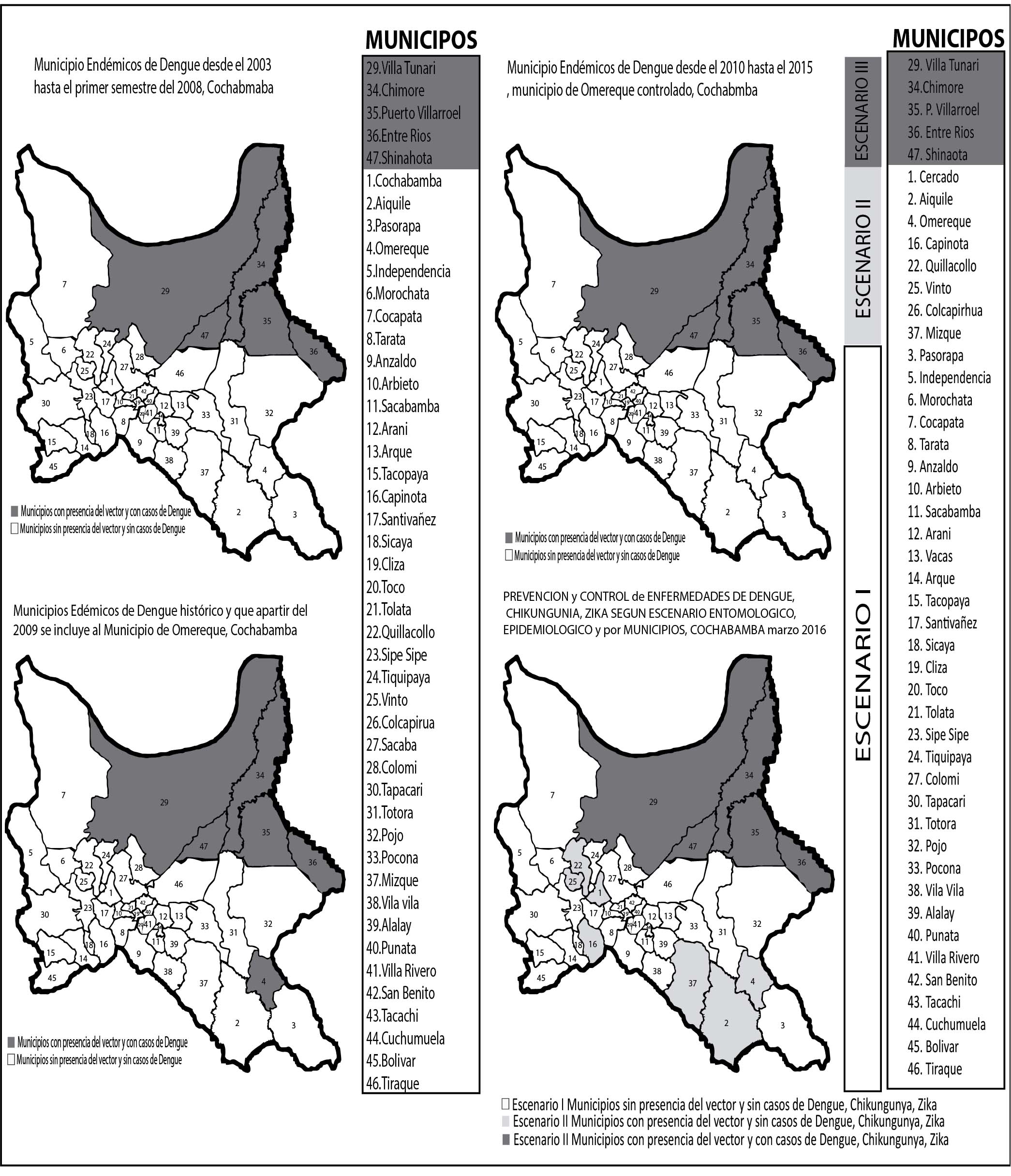 Los municipios aledaños a Cochabamba en los que se encontró el vector son: Quillacollo, Colcapirhua, Vinto, Sipe Sipe, Tiquipaya y en municipios distantes: Capinota, Omereque Mizque, Pojo Aiquile y Mizque en alturas que oscilan entre los 2000 a 2500 m s.n.m. como se identifica en el Gráfico 1, además se observa el cambio de un escenario epidemiológico tipo I a tipo II en el 2016, como se muestra en el Gráfico 1 y Mapa 1.