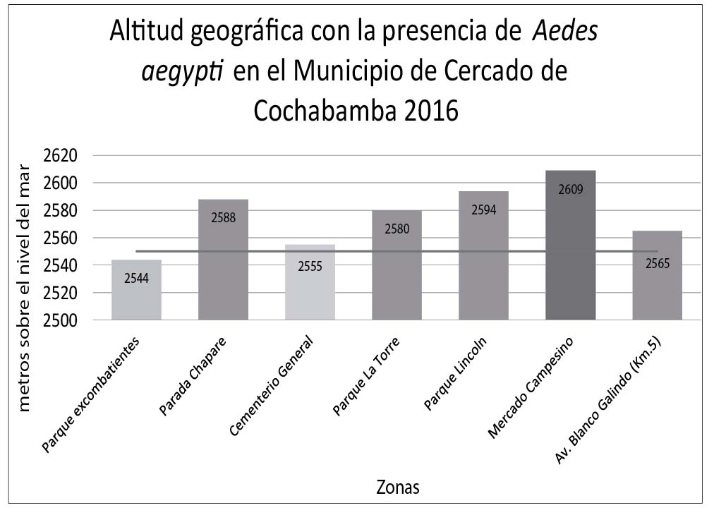 En cuanto a las altitudes en las cuales se ha observado la presencia del vector Aedes aegypti dentro el municipio de Cochabamba, se observa un resultado importante en zonas noroeste en el barrio de Sarcobamba en el parque Excombatientes, donde fueron los primeros hallazgos de larvas con una altura reportada de 2 548 m s.n.m, considerada como el nivel más bajo y en la zona sur Barrio Valle Hermoso en el mercado campesino a 2 609 m s.n.m., como el nivel más alto, como se muestra en el Gráfico 2; considerando a ésta zona como la de mayor riesgo por ser sitio de llegada de vehículos del trópico cochabambino. En cuanto a los lugares del Municipio de Cercado infestados y colonizados con larvas del vector Aedes aegypti, se describen tres zonas de la ciudad: zona nor este (urbanización Magnolias Sarcobamba, Beijing e Hipódromo, Av. René Moreno y parque Demetrio Canelas, plazuela Franz Tamayo, Cala Cala, Pacata baja, Servicio de Caminos).