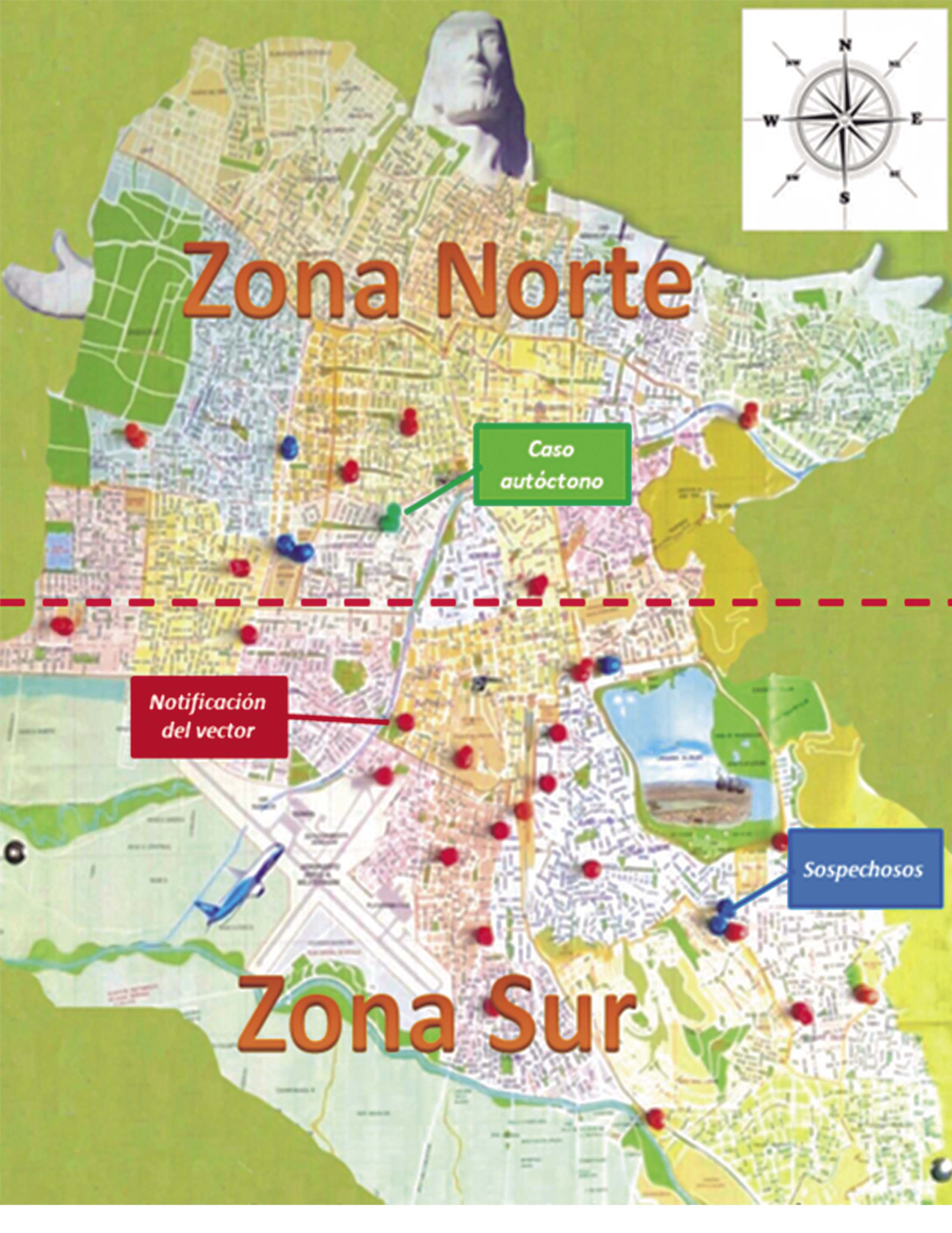 En zona Central (calle Lanza y Heroínas) y en la zona Sur (Av.Aroma y Suipacha, Av. siglo XX, Alalay, Av. Perú, Cementerio General, Av. Panamericana, Villa Loreto, El Avión, Jaihuayco, República y Pulacayo, San Carlos, Barrio ferroviario, Colombia y Falsuri. Final avenida Panamericana, 9 de abril este, Villa Venezuela, Parada Chapare, Av. Killman), como se observa en la Figura 2, que muestra el plano del municipio de Cochabamba, empleado para el registro de la notificación de casos y presencia del vector por zonas, así como el primer caso notificado, a partir del cual se inicia la búsqueda, evidenciando una mayor concentración de los puntos de notificación en la Zona Sur de la ciudad, donde se identificó el mayor predominio del mosquito del género Culex sp. ( Figura 1)
