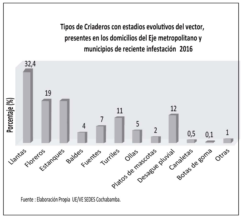 Chikungunya, tanto del exterior como del interior, lo que representa alto riesgo para la transmisión de estas enfermedades en las nuevas áreas de dispersión del vector. Hasta el momento julio 2016 solo se evidencio la presentación autóctona de un caso en la ciudad de Cochabamba. La dificultad en la provisión y almacenamiento de agua en las viviendas, son factores fundamentales para la proliferación de criaderos potenciales para