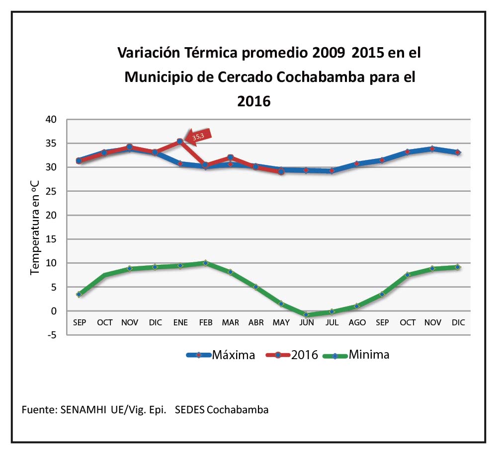 En relación a la temperatura, se observó que favorece en la aclimatación del vector y su multiplicación, registrandosé un incremento inusitado de la temperatura ambiental durante los meses de enero y febrero 2016, que llegó a un pico de 35,5ºC reportado por el SENAMHI, como se muestra en el Gráfico 4.