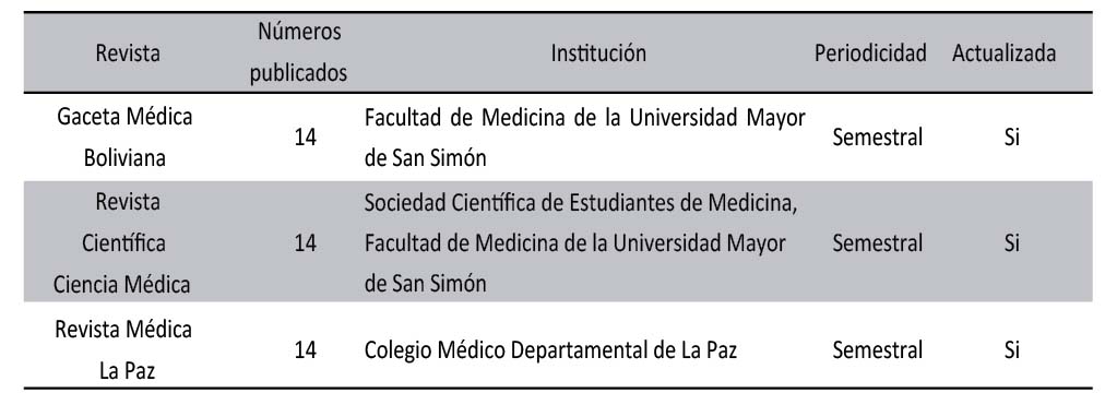 En la revisión de la base de datos de SciELO-Bolivia, en la materia de ciencias de la salud se encontraron cuatro revistas indizadas, de las cuales solo tres cumplen la periodicidad semestral, misma que están actualizadas al periodo de estudio ( Tabla 1).