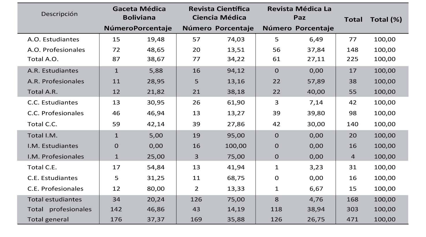 La contribución de publicaciones por parte de los profesionales, sobresalen con una participación del 46,86 % en la Gaceta Médica Boliviana y 38,94% en la Revista Médica La Paz, a excepción de la Revista Científica Ciencia Médica que alcanza solo el 14,19% respecto del total publicaciones (471).