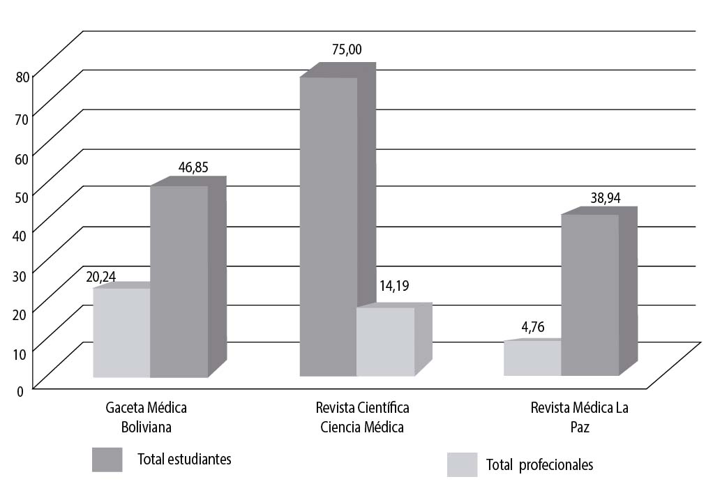 Con relación a la participación porcentual de estudiantes y profesionales según revistas, se observa en el caso de los estudiantes de pregrado una contribución poco significativa en la Revista de Gaceta Médica Boliviana y Revista Médica La Paz con el 20,24% y 4,75%, respectivamente. Sin embargo, la Revista Científica Ciencia Médica presenta una mayor participación de los estudiantes con el 75,00%, situación que podría deberse a que esta revista esta compuesta por estudiantes y profesionales de las ciencias de la salud, que dan mayor oportunidad a ambos actores ( Figura 1).