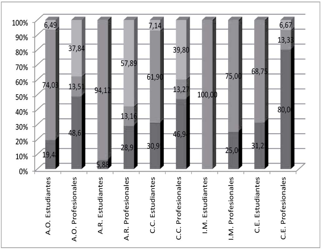 Concerniente a la participación de los estudiantes y profesionales por tipo de publicaciones según revistas, destaca la presencia de estudiantes con el 74,03 % en el caso de Artículos Originales en la Revista Científica Ciencia Médica, en cambio los profesionales presenta una contribución relativamente importante con el 48,65% en la Gaceta Médica Boliviana y 37,84% en la Revista Médica La Paz; por su parte, en lo que se refiere a Artículos de Revisión los estudiantes tienen una presencia significativa en la Revista Científica Ciencia Médica con el 94,12% y los profesionales sobresalen con el 57,89% en la Revista Médica La Paz. Respecto a la presencia de los estudiantes en las publicaciones de Casos Clínicos muestra una participación del 61,90% en la Revista Científica Ciencia Médica y en el caso de los profesionales se distribuye su aporte con el 46,94% en la Gaceta Médica Boliviana y 39,80% Revista Científica Ciencia Médica ( Figura 2).
