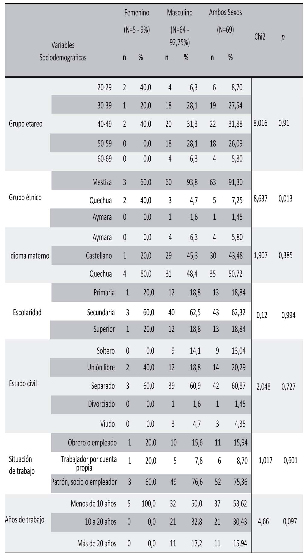 Se contó con la participación de 69 personas, con una edad promedio de 43,5±9,79 años, existiendo una diferencia estadísticamente significativa entre la edad por sexo (Mujeres:34,60±6,99 años y Varones: 44,36± 9.67 años; p=0,031). Las características sociodemográficas de la población de estudio se describen en la Tabla 1; resaltando que el 91,3% de los participantes se consideran mestizos; la lengua materna más frecuente fue el quechua (50,72%); 62% completaron la secundaria; 60,8% viven separados de sus parejas (esta proporción fue similar en ambos sexos); solo el 15,94% eran empleados u obreros, con una presencia mayoritaria de patrones, socios o empleadores (75,36%); con una proporción mayoritaria de conductores que trabajan de manera continua por menos de 10 años (53,62%), que en el caso de las mujeres, el 100% de los casos son parte de este grupo. Las diferencias asociadas al sexo entre los diferentes grupos sociodemográficos, solo fue significativo en el caso del grupo étnico (p=>0,05), por lo que ambos grupos se consideran similares y comparables en razón de subgrupo de estudio ( Tabla 1).