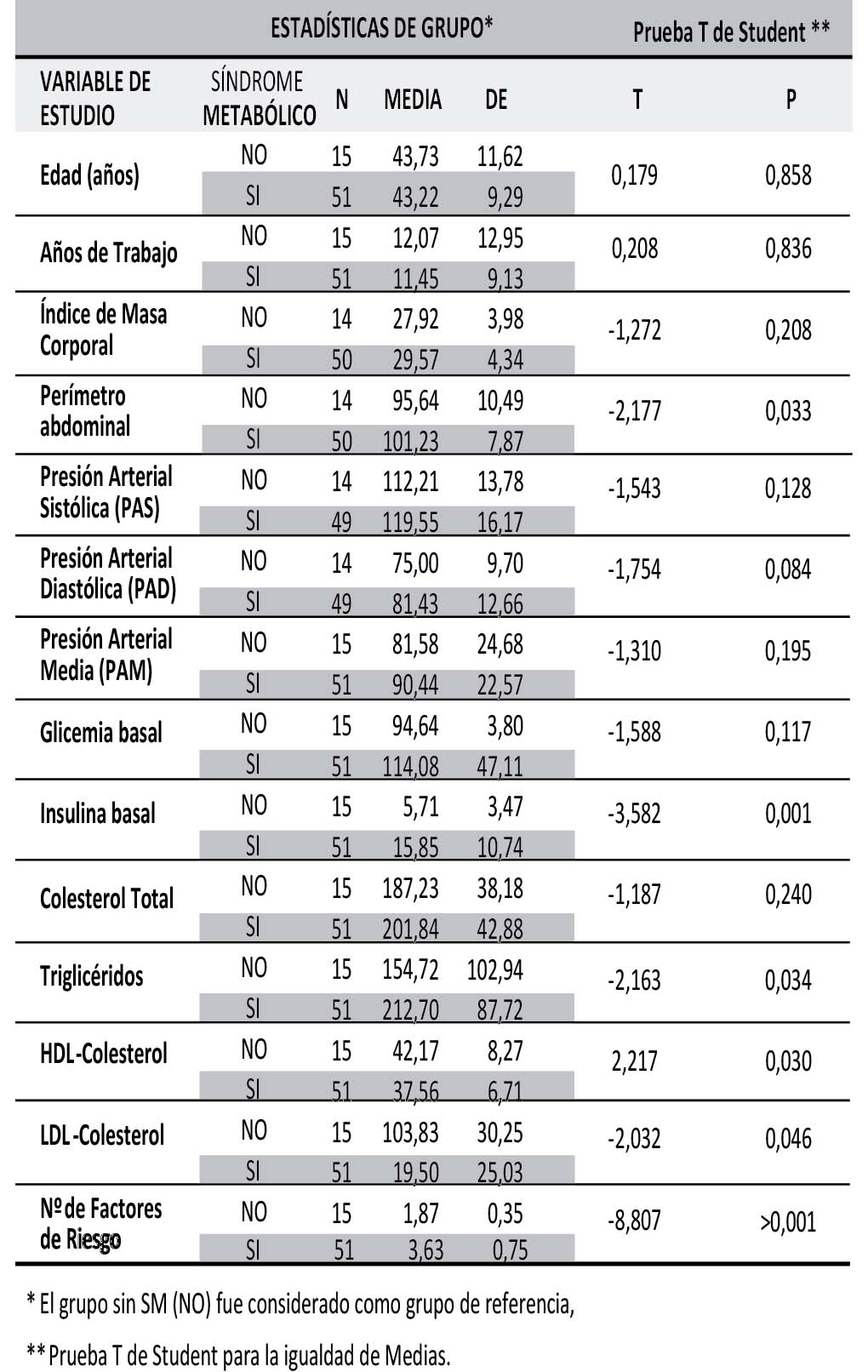 El análisis descriptivo de las variables cuantitativas nos permite observar diferencias en el comportamiento de las variables de evaluación entre los conductores con SM y sin SM, en casi todos los casos los valores medidos fueron menores en los que no presentaban SM (valor negativo de la prueba de T de student), solo la medición de HDL-colesterol fue superior en sujetos sin SM, considerando que el indicador es negativo cuando los valores son por debajo del estándar; sin embargo, esta diferencia entre las medias para los parámetros evaluados, solo fue estadísticamente significativa para el perímetro abdominal (p=0,003), insulina basal (p=0,001), Triglicéridos (p=0,034), HDL-c(p=0,030), LDL-c (p=0,046) y el número de factores de riesgo presentes por sujeto de estudio (p=>0,0001) ( Tabla 2).