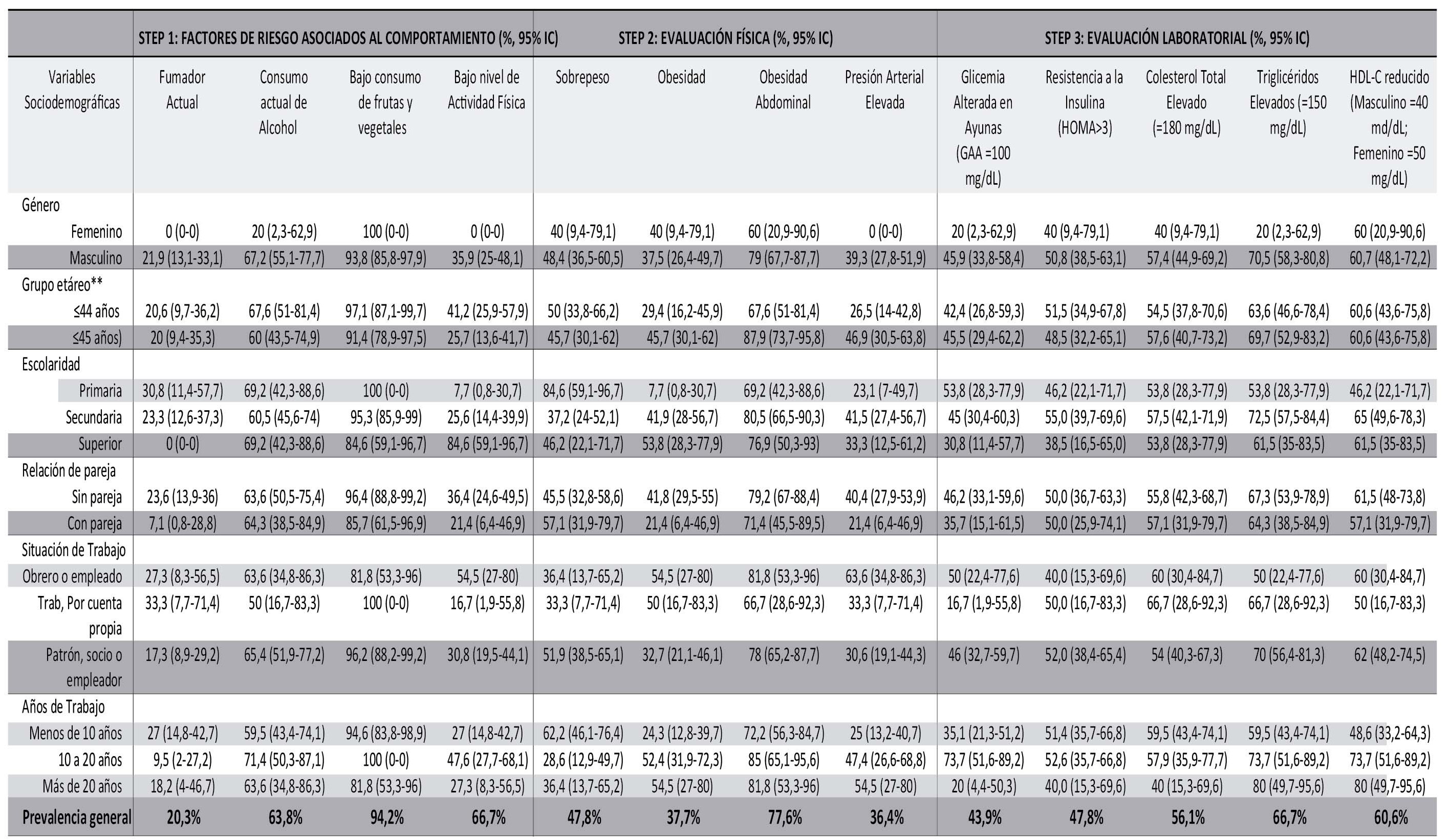 Resultados: las prevalencias de los factores de riesgo asociados a Síndrome Metabólico fueron: STEP-1: Tabaquismo 20,3%; consumo actual de alcohol 63,8%; bajo consumo de frutas y vegetales 94,2%; sedentarismo o bajo nivel de actividad física 66,7%. STEP-2: sobrepeso 47,8%; obesidad 37,7%; cintura de riesgo u obesidad abdominal 37,7% y presión arterial elevada en 36,4%. STEP3: Glicemia alterada en ayunas 43,9%; Resistencia a la Insulina 47,8%; colesterol total elevado 56,1%; Triglicéridos elevados 66,7% y HDL-colesterol reducido en el 60,6%.