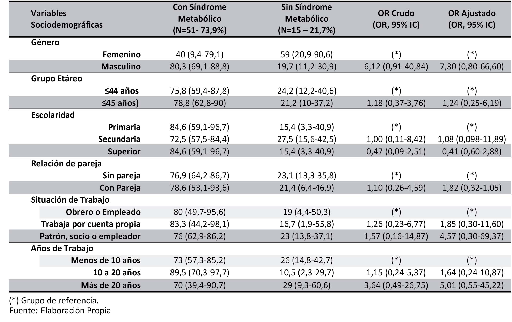 La prevalencia global de SM fue 73,9%; la misma que fue significativamente más alta en los siguientes subgrupos: Varones (80,3%), mayores de 45 años (78,8%), nivel educativo primario (84,6%) y secundario (84,6%), con pareja (78,6%), trabajadores por cuenta propia (83,3%), y aquellos que trabajan entre 10 a 20 años en este rubro (89,5%). En esta misma tabla se evalúa la probabilidad de desarrollar Síndrome Metabólico por la pertenencia (factor de exposición) a alguno de los subgrupos de estudio, en contraste al grupo de referencia intragrupo y ajustada (OR-ajustado) para todas las variables sociodemográficas de estudio; observándose una mayor probabilidad de desarrollar Síndrome Metabólico en los varones (OR:7,30; 95%IC:0.80-66.6) en contraste con las mujeres y aquellos con más de 20 años de trabajo (OR:5,01; 95%-IC:0,55-45,22), en contraste a los que trabajan por menos de 10 años en el rubro; sin embargo, en todos los casos no fue estadísticamente significativa, por el tamaño muestral del presente estudio y la desagregación de los sub-grupos utilizados por la metodología STEPS ( Tabla 4).