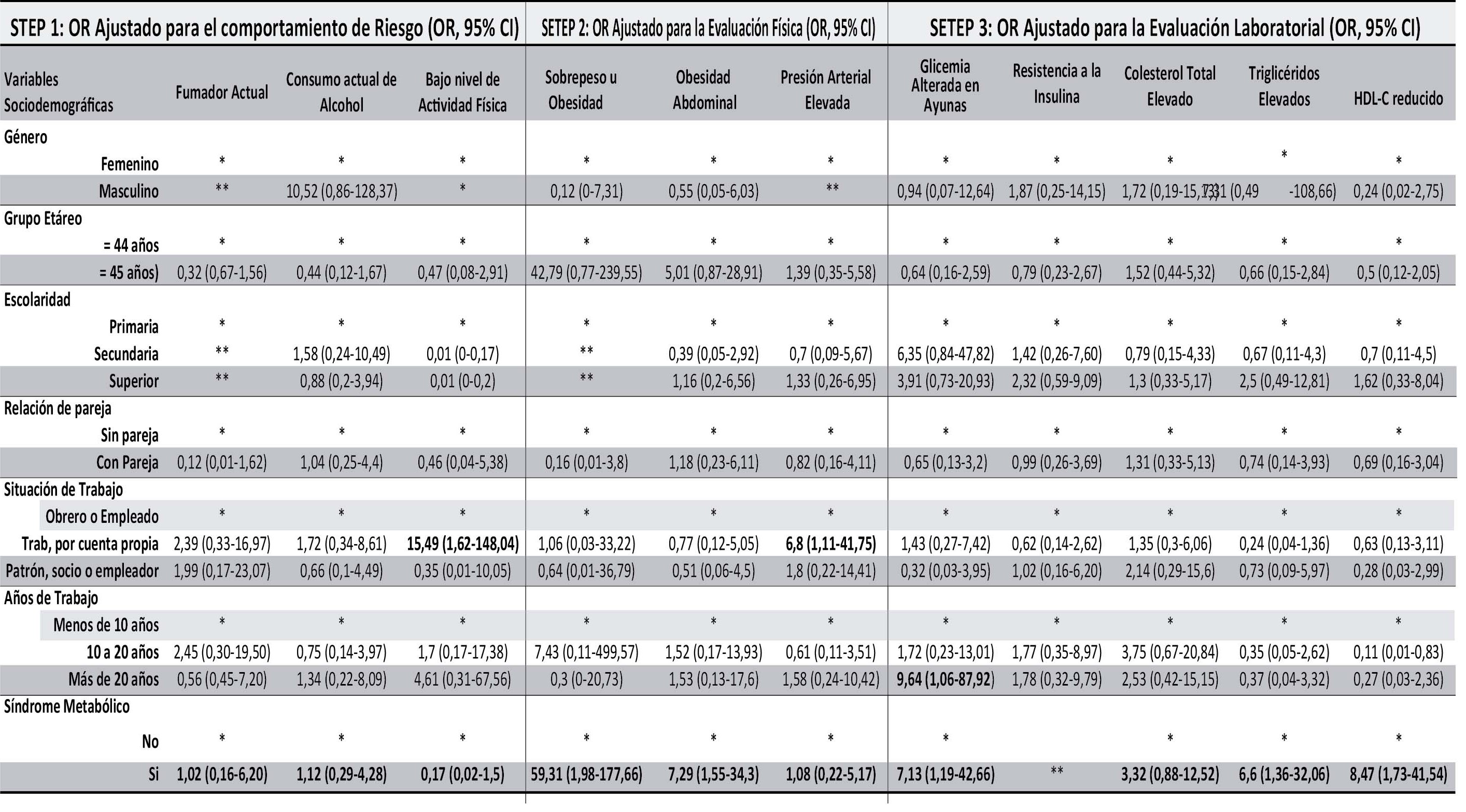 Para el STEP-3; la prevalencia de glicemia alterada en ayunas (GAA) fue de 43,9%; siendo significativamente más altas en los Varones (45,9%), conductores con educación primaria (53,8%), y aquellos con 10 a 20 años de trabajo (73,7%). La Resistencia a la Insulina (HOMA >3), se presentó en el 47,8% de los participantes; con una distribución proporcional homogénea en todos los subgrupos de estudio, con prevalencias superiores al 40%; cabe resaltar que todos los casos correspondieron a sujetos con Síndrome Metabólico. El Colesterol Total elevado, estuvo presente en 56,1% de los participantes, con un comportamiento similar al anterior, con prevalencias superiores al 40% en todos los subgrupos, siendo la más alta en el subgrupo de trabajadores por cuenta propia con un 66,7%. Los Triglicéridos elevados tuvo una prevalencia de 66,7%; siendo más frecuente en varones (70,5%) y elevándose significativamente en aquellos con más de 20 años de trabajo (80%). El HDL-Colesterol reducido se presentó en el 60,6% de los participantes, siendo los subgrupos más afectados, aquellos que tienen más años de trabajo (10-20 años= 73,7%; más de 20 años=80%) ( Tabla 3).