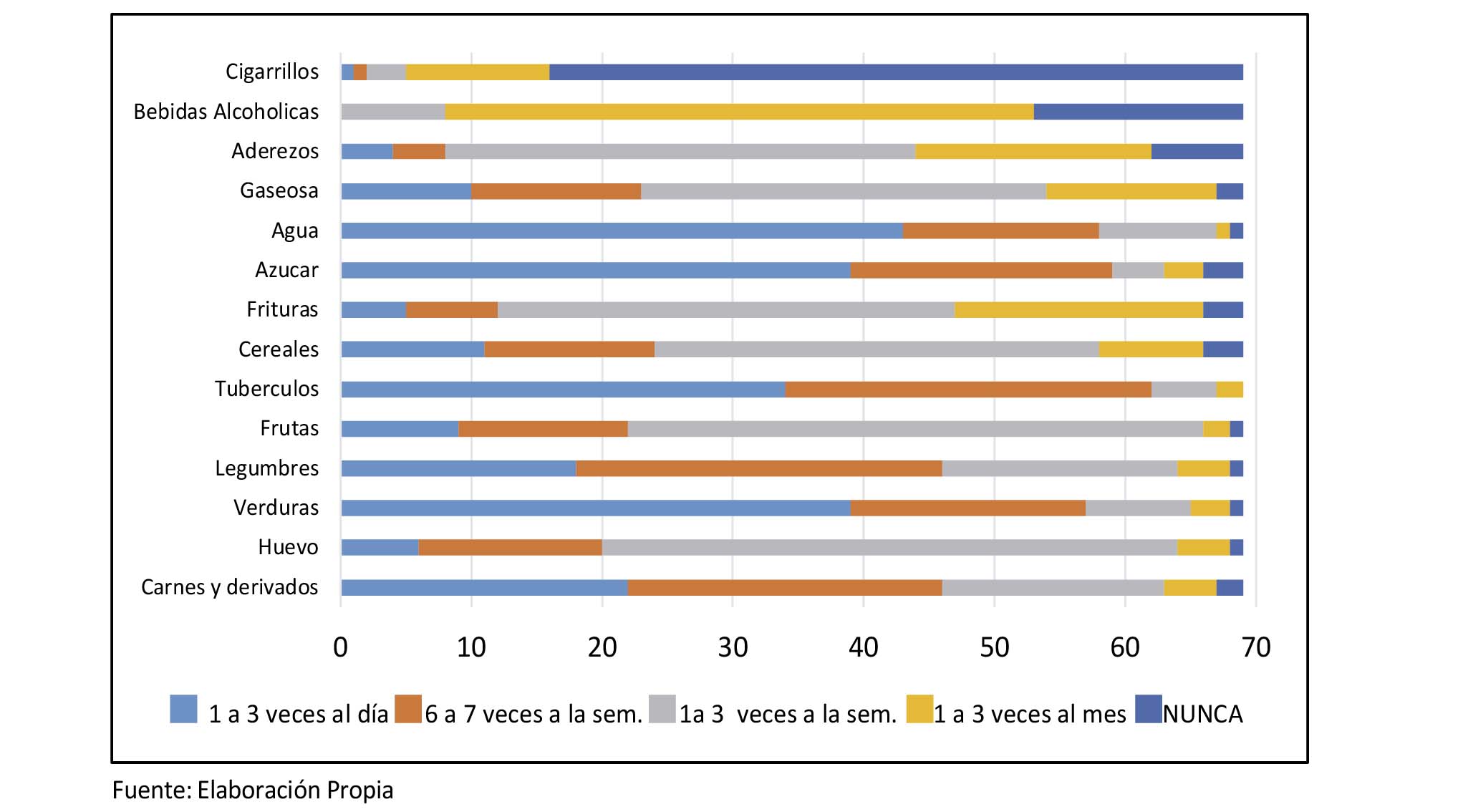 Elaboración PropiaLa Figura 1 muestra una estimación de la frecuencia de consumo en el perfil de dieta habitual de los conductores participantes en el estudio, resaltándose una predilección por los alimentos a base de carbohidratos (Azúcar y Tubérculos 1 a 3 veces al día, todos los días), asociada al consumo habitual durante la semana de aderezos, gaseosas, cereales y frituras ( Figura 1).
