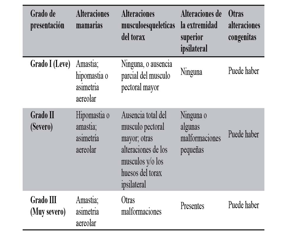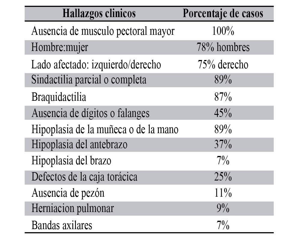 Es bien sabido que el Síndrome de Poland se puede asociar a otras malformaciones. En especial las derivadas al sistema musculoesquelético y en particular en el mismo lado de la afección 3, 4 ( Tabla 2).
