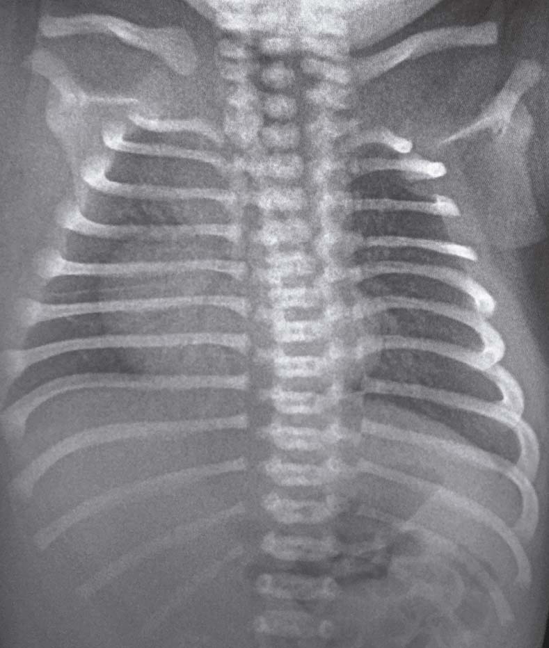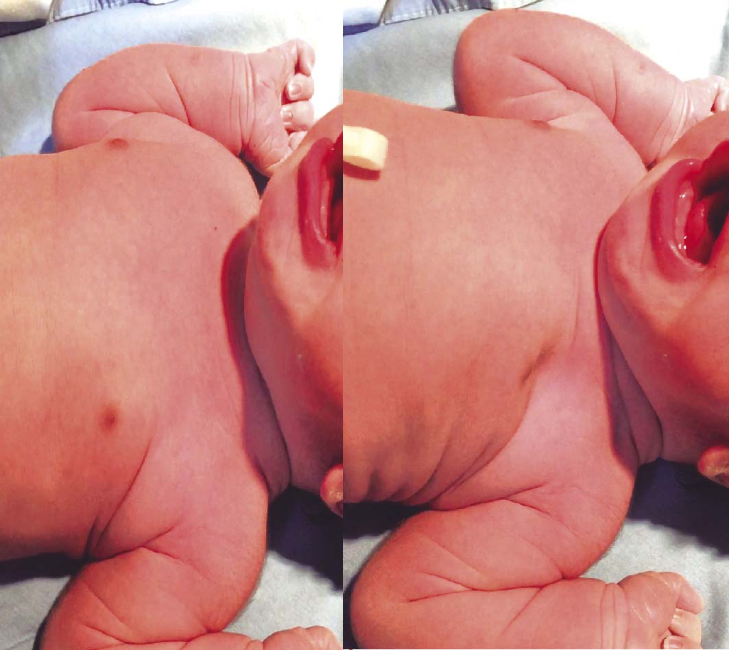 La saturación de oxigeno era del 92% a los 5 minutos de vida, APGAR 9 al minuto y a los 5 minutos. Auscultación pulmonar y cardiaca sin anormalidades. Se evidencia cianosis acral propia del recién nacido. La inspección del hemitórax izquierdo evidencia una disminución del tejido subcutáneo, masa muscular e hipoplasia del pezón ( Figura 2).