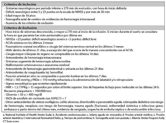 Desde 1996, en base al estudio NINDS rTPA Stroke Study 5, se implementa el manejo estándar del ACV isquémico agudo. Con nivel de evidencia 1 A, estas guias se basan en las unidades de ACV 10 y la trombolisis intravenosa con activador tisular recombinante del plasminógeno (r-TPA), con una ventana terapéutica de tres horas desde el inicio de los síntomas, decreciendo el beneficio del tratamiento con el tiempo que transcurre desde el comienzo de los síntomas hasta el inicio del tratamiento 5. Este protocolo de tratamiento se asocia a un 30% de reducción de discapacidad en comparación a los pacientes con ACV isquémicos no trombolisados y 20% de reducción en mortalidad en la fase aguda 5.