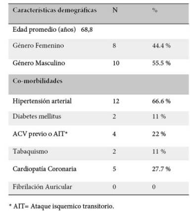 Resultados: el Tiempo Síntoma-Puerta alcanzo a 62,7 +/- 38 min, mientras que el Tiempo Puerta-Aguja fue de 53,6 +/- 15 min. y Tiempo Síntoma-Aguja 114,6 +/- 43 min. Se registraron complicaciones en 6 (33,3%). promedio de 4,6 +/- 3 días de internación en la clínica, pasando un promedio de 2,8 +/- 2 días en la Unidad de ACV. La tasa de mortalidad fue de 16,6%. Según la Escala Modficada de Rankin, tuvieron un puntaje de 0-1 mRS.
