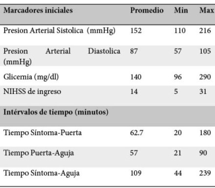 La severidad del compromiso neurológico inicial fue evaluada con el NIHSS de ingreso, cuyo promedio fue de 14 +/- 7 puntos. El Tiempo Síntoma-Puerta alcanzo a 62,7 +/- 38 min, mientras que el Tiempo Puerta-Aguja fue de 53,6 +/- 15 min. y Tiempo Síntoma-Aguja 114,6 +/- 43 min.