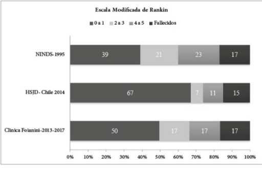 A los tres meses de sucedido el ACV, se usó la Escala Modificada de Rankin (mRS) para evaluar la discapacidad en cada paciente. Un puntaje de 0-1 en mRS 4,5,7 es considerado como una medida de resultado favorable.