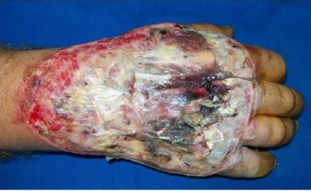 Por consiguiente, se diagnostica: mano catastrófica derecha con mutilación dorsal, fractura expuesta Gustilo III-B de 2 do, 3 er, 4 to, 5 to metacarpianos, sección de aparato extensor con defecto tendinoso.
