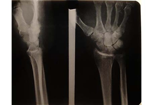 Se solicita radiografía de mano en el que se evidencia soluciones de continuidad en el tejido óseo con pérdida de las corticales posteriores en el 2 do, 3 er, 4 to, 5 to metacarpianos. ( Figura 2).