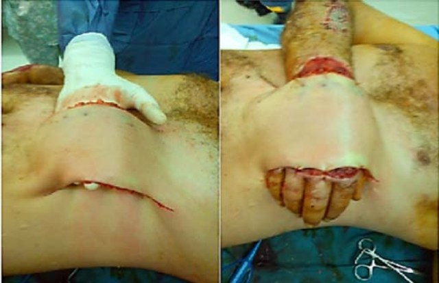 En el presente caso se usa una variante de los colgajos abdominales y su irrigación, el colgajo toracoabdominal, mostrando un patrón de vascularización randomizada cuidando preservar una base pedicular ancha en relación a la longitud, lo cual asegura la vitalidad del mismo.