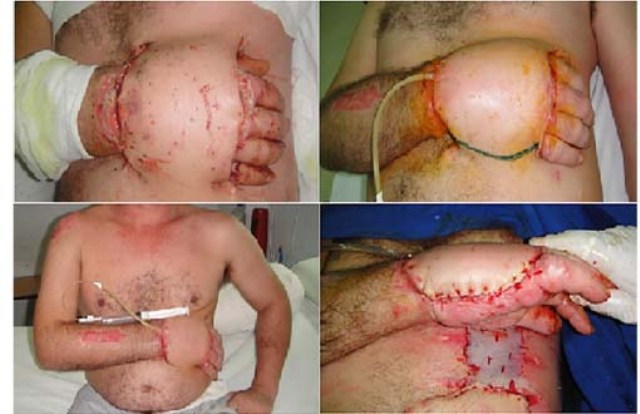 Otra alternativa para la cobertura de las lesiones en extremidad superior se muestra el uso de colgajo toraco-umbilicales, siendo estos muy útiles para cubrir lesiones principalmente en la parte proximal y media del antebrazo, así como también en mano.