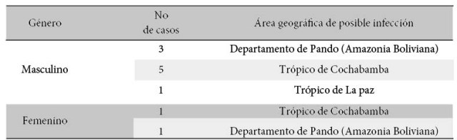 Todos los pacientes eran residentes de la zona tropical de Bolivia. La tabla 1, muestra la distribución del número de pacientes por género y área geográfica de probable infección. La edad de los pacientes estaba comprendida en el rango de 21 y 38 años con una media de 28 años.