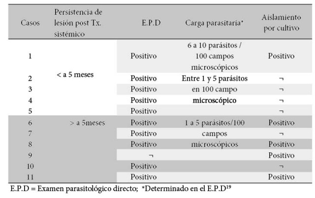 Todos los casos antes de la aplicación del tratamiento perilesional tenían parásitos en las lesiones (determinados por técnicas de laboratorio) independientemente de la antigüedad que tenía la lesión, después de haber concluido el tratamiento sistémico ( Tabla 2).