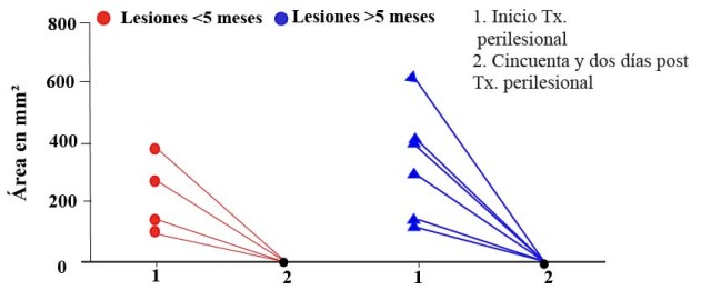 La inoculación se realizó sobre el borde de la lesión en cada punto cardinal con una jeringuilla para aplicación de insulina. El área de las lesiones previas a la intervención perilesional fue variable, pero todas llegaron a la cicatrización completa a los cincuenta y dos días posterior a la última aplicación ( Figura 1).
