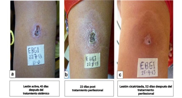 La aplicación perilesional de antimoniales en estos pacientes mostró cicatrización completa a los 52 días post tratamiento perilesional ( figura 2) en todos los casos, efectos adversos locales y una buena adherencia al tratamiento. Este reporte debería considerarse como una evaluación piloto para desarrollar futuras investigaciones en este campo para contar con alternativas de tratamiento seguro, de bajo costo y con alta adherencia para los pacientes con falla terapéutica al tratamiento sistémico con antimoniales pentavalentes.