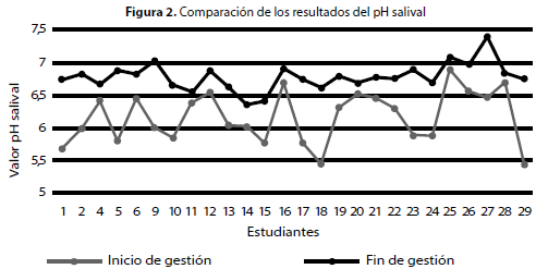 Resultados del pH salival: en la primera toma se obtuvo un valor promedio de 6,79 y en la segunda toma el pH descendió dando un valor promedio de 6,20. En la figura 2 se pueden apreciar los valores del pH salival de los 26 estudiantes comparando la primera toma con la segunda.