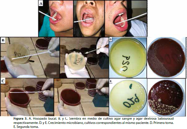 Las 26 muestras de saliva fueron remitidas al Laboratorio de Servicios del Departamento de Química de la Facultad de Ciencias y Tecnología de la UMSS, donde se determinó el pH salival de cada uno de los casos. El pHmetro utilizado fue ORION pHmeter modelo 420A. Por otro lado, las 26 muestras del hisopado bucal fueron remitidas al laboratorio ?Bio de Línea? (servicios microbiológicos), se las sembraron en agar sangre y agar dextrosa Sabouraud, este último fue utilizado con la finalidad de evidenciar el desarrollo de levaduras. Al observar desarrollo de colonias de Staphylococcus spp., Staphylococcus aureus, Klebsiella spp y Escherichia coli, se emplearon: medio de cultivo de agar manitol salado, cepa ATCC 25923 S. aureus, serie bioquímica, cepa ATCC 25922 E. coli, respectivamente y tinción de Gram a todos los microrganismos estudiados ( Figura 3).