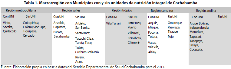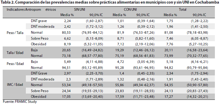 Methods: an ecological cross-sectional study with aggregated data by municipality was conducted, using the information collected by the departmental study on Risk Factors Associated with Child Malnutrition in Cochabamba (FRAMIC). The municipalities with and without UNI from Cochabamba were the analysis units. Prevalence averages of the municipal level were calculated by the study group, accompanied by standard deviations and student?s T-test for statistical differences. For the analysis of inequalities, the concentration index of the accumulated prevalence per study group was used.