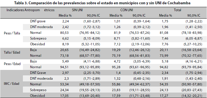 El indicador peso/talla, nos muestra una mínima diferencia en la desnutrición aguda grave, siendo elevada en municipios sin UNI (2,24% IC90%: 1,60-2,87); la misma situación se presenta para la desnutrición moderada (2,42% IC90%: 1,72-3,12). En el caso de estado nutricional normal, este es mayor en municipios con UNI (81,90% IC90%: 76,53-87,26). El sobrepeso es mayor también en municipios con UNI (8.71% IC90%: 5,82-11,60); en el caso de la obesidad ésta es mayor en municipios sin UNI (8,19% IC90%: 5,32-11,05). La desnutrición crónica (Talla/Edad) es relativamente mayor en municipios sin UNI (20,65% IC90%: 16,49-24,82). La talla normal es mayor en municipios con UNI (75,19% IC90%: 68,56-81,83). La desnutrición global (peso/edad) es mayor en municipios sin UNI (5,49% IC90%: 4,11-6,88). En cuanto a los datos del IMC/Edad presentan el mismo comportamiento del indicador peso/talla. Ninguno de los indicadores evaluados presenta diferencia estadísticamente significativa ( Tabla 3).