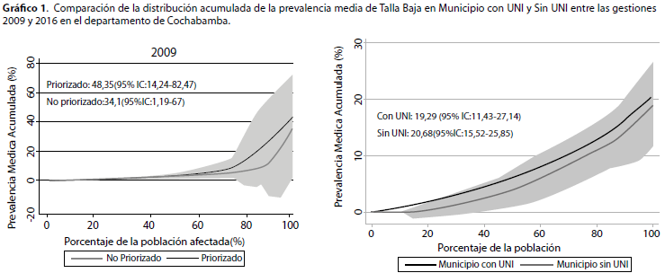 La misma gráfica muestra que la diferencia no es significativa, lo que desde el punto de vista de la desigualdad es bueno, demostrando con esto que la implementación de las UNI ha disminuido la tendencia de brecha de desigualdad entre ambos grupos, observándose que los municipios donde fueron implementadas las UNI?s en principio (2009) presentaban prevalencias más altas de talla baja (Priorizado= 48,35% vs No priorizado= 34,1%), que si bien no fue erradicado, estos han reducido en mayor proporción (29,6%) que los municipios sin UNI (13,42%) desde el 2009 al 2016 ( Gráfico 1).