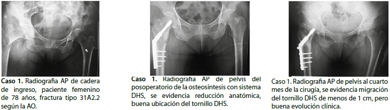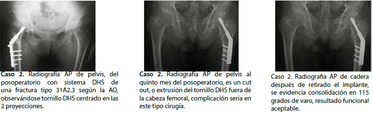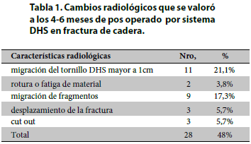 Al describir la evolución radiológica postoperatoria de la osteosíntesis en pacientes tratados con sistema DHS se encontró cambios radiológicos no favorables, entre ellos migración del tornillo DHS, rotura o fatiga de material, migración de los fragmentos, desplazamiento de la fractura, impactación y cut out, siendo esta última considerada como una verdadera y seria complicación que se presentó en el 5,6% de los casos.