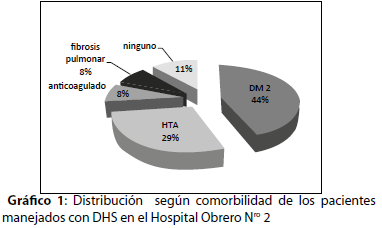 Más del 70% de los casos presentaron morbilidad o comorbilidad, diabetes mellitus en el 44% 23 hipertensión arterial en el 29% (15), un 10% representado por pacientes con fibrosis pulmonar y anticoagulados, y tan solo el 11% 6 no tenían antecedentes patológicos.