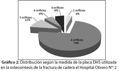 En 73% (38 casos) se utilizó la placa DHS de 4 orificios, pero también se usó otras medidas, desde dos orificios en las fracturas estables y hasta de 6 orificios, en los casos de extensión subtrocanterica.
