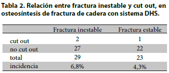 Al hacer un análisis bivariado entre fractura inestable y presentación de cut out, se encontró una leve asociación con un Riesgo Relativo (RR) de 1,5; del cual se concluye que los pacientes con fracturas inestables, tienen 1,5 veces más riesgo de presentar la complicación de cut out.