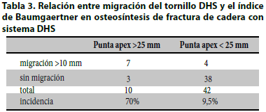 También tomamos en cuenta la migración del tornillo DHS mayor a 10 mm y su relación con el índice de Baumgaertner. Por lo tanto, la colocación del tornillo DHS con un índice punta ápex mayor a 25 mm aumenta la probabilidad en 7,4 veces el riesgo de migración del tornillo DHS sin llegar a un cut out.