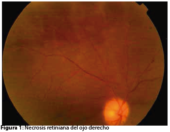 Al examen del fondo de ojo, bajo midriasis, presenta en el OD necrosis retiniana a temporal superior de la retina periférica ( Figura 1), que no compromete mácula, en OI se evidencia desprendimiento de retina seroso extenso, con extensas áreas de necrosis retiniana, que compromete mácula y vitreitis.