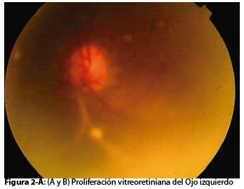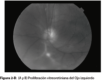 La evolución fue favorable durante los primeros 4 meses de tratamiento, evidenciándose en OD una zona de atrofia del epitelio pigmentado de la retina (EPR) periférica del área temporal inferior y en OI retina aplicada isquémica, con áreas de proliferación vitreoretiniana ( Figura 2, A y B).
