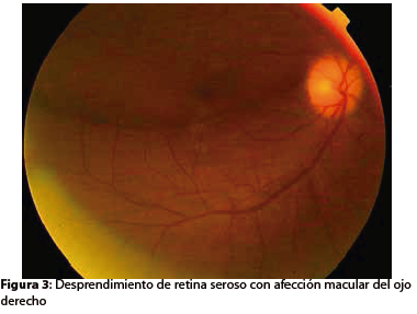 Posterior al cual el paciente retorna por disminución de la visión en el OD, de dos días de evolución, siendo la AV en OD de cuenta dedos a 3 metros y en OI, No percepción de luz (NPL), a la biomicroscopía presenta en OD precipitados queráticos finos y células en cámara anterior de 2+. Al fondo de ojo se evidencia en OD desprendimiento de retina superior que compromete parcialmente mácula con múltiples desgarros pequeños y vitreítis, moderada ( Figura 3) acompañado de áreas de necrosis retiniana periférica, en los 360° de la retina. Los resultados de laboratorio destacan la serología para CMV: IgM: 2,5 (VN: < 0,9) y IgG: 2,0 (VN: < 0,9).