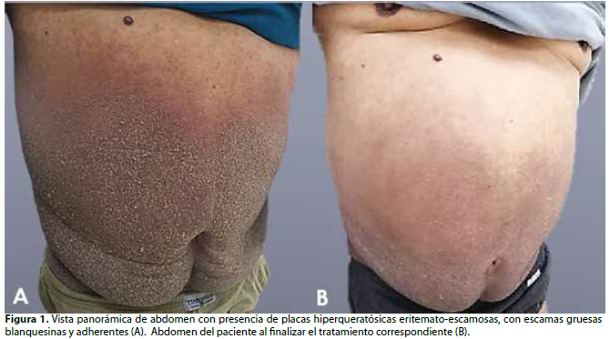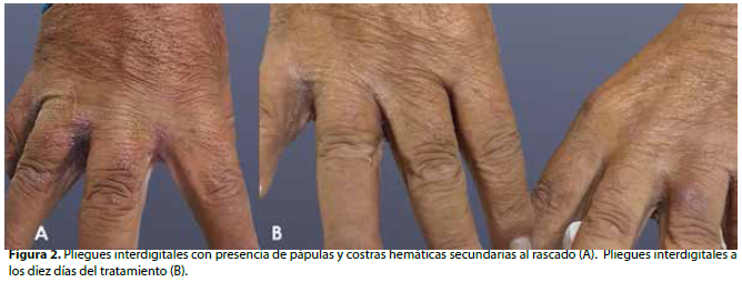 Se presenta el caso clínico de un paciente masculino de 68 años de edad que acude a consulta externa del servicio de dermatología presentando una dermatosis diseminada a nivel del tronco, región lumbar, región glútea, genitales, muslos, pliegues axilares, espacios interdigitales y afectación del dorso de los pies; de aspecto polimorfo caracterizado por múltiples pápulas que forman placas muy pruriginosas hiperqueratósicas, eritematoescamosas, con escamas gruesas blanquecinas y adherentes, acompañadas de costras hemáticas secundarias al rascado ( Figura 1-Ay 2-A).