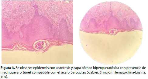 Al no ver mejoría del cuadro y debido a nueva información de que en la familia del paciente tanto el hijo como la esposa empezaron a presentar sintomatología similar, se solicitó una biopsia incisional de lesión en piel de abdomen para mayor certeza diagnóstica, el cual reportó en los resultados un infiltrado superficial y profundo de linfocitos, histiocitos, mastocitos y eosinófilos, con presencia de vesículas espongióticas en la epidermis, destacando la presencia de madriguera de una ácaro compatible con Sarcoptes Scabiei ( Figura 3).