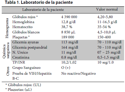 Al examen físico, la paciente ingresa en regular estado general, consiente y mucosas ligeramente pálidas, con signos vitales de PA 108/75 mmHg, FC: 83 latidos/minuto, saturación de oxígeno 95%.